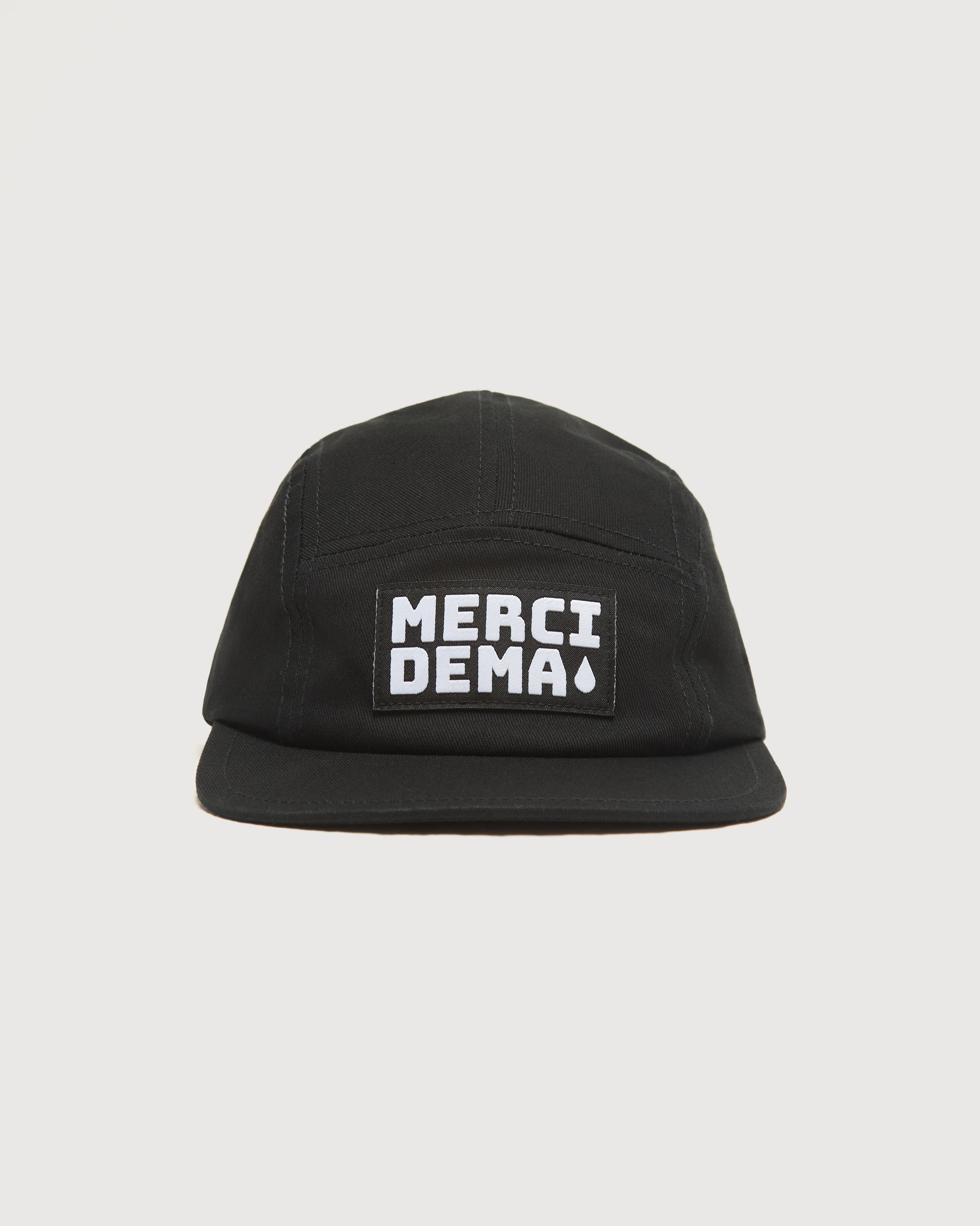 - Colorway: Noir hat with noir & cloud woven label featuring single tear drop in “Merci Dema” logo